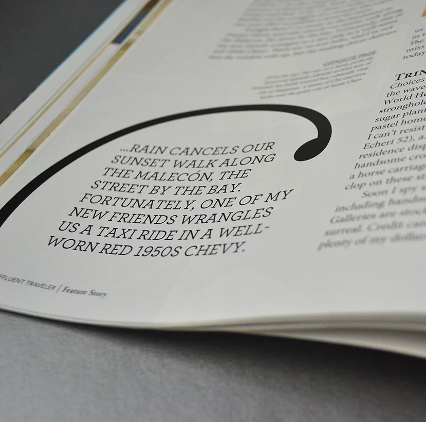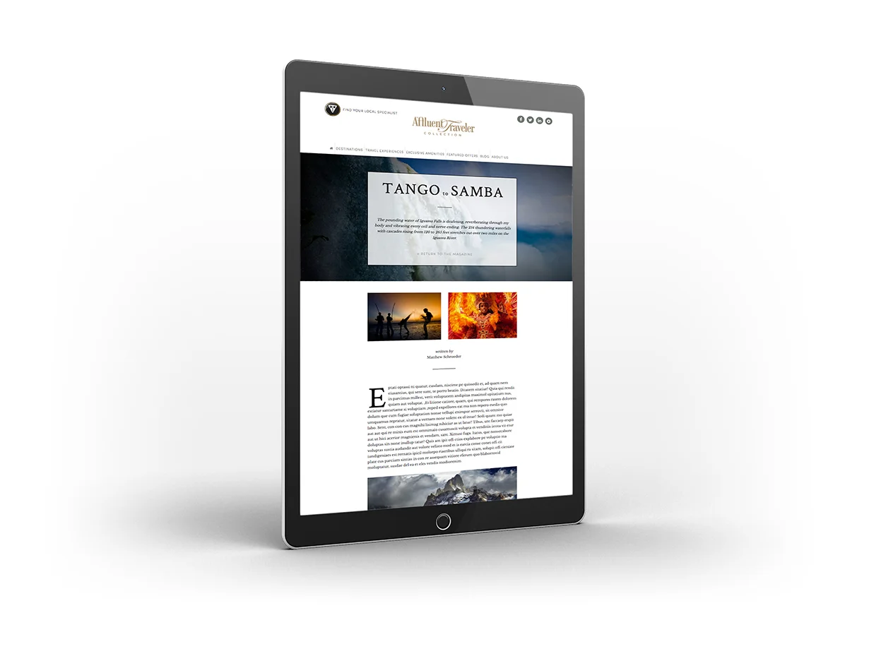 I have had the pleasure of designing for and directing the creative on our luxury travel publication, The Affluent Traveler, for the past decade. It has instilled in me a love and passion for travel and given me a glimpse into a side of it previously unknown. In fact, most readers can only dream of stepping foot in these places or spending a night as royalty — but with a thoughtful eye for photos and fonts, perhaps I've brought them there, if even for a fleeting moment.